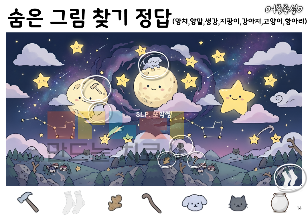 안녕하세요. 또박쌤입니다! 본 자료는 어중종성과 어말종성 ㅇ 위치에서 조음이 어려운 대상자들을 위해 제작하였습니다. 퍼즐판과 숨은 그림 찾기 활동을 통해 즐거운 조음 연습 시간이 되길 바랍니다. 감사합니다.