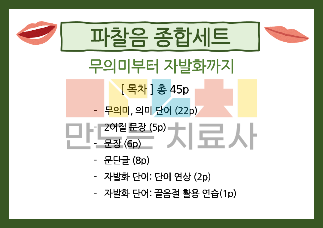 말운동장애, 학령기 이상 학생의 파찰음 연습 활동지로 사용해보세요! 본 활동지는 글자로만 구성되어 있습니다. [ 목차 ] 총 45p - 무의미, 의미 단어 (22p) - 2어절 문장 (5p) - 문장 (6p) - 문단글 (8p) - 자발화 단어: 단어 연상 (2p) - 자발화 단어: 끝음절 활용 연습(1p)