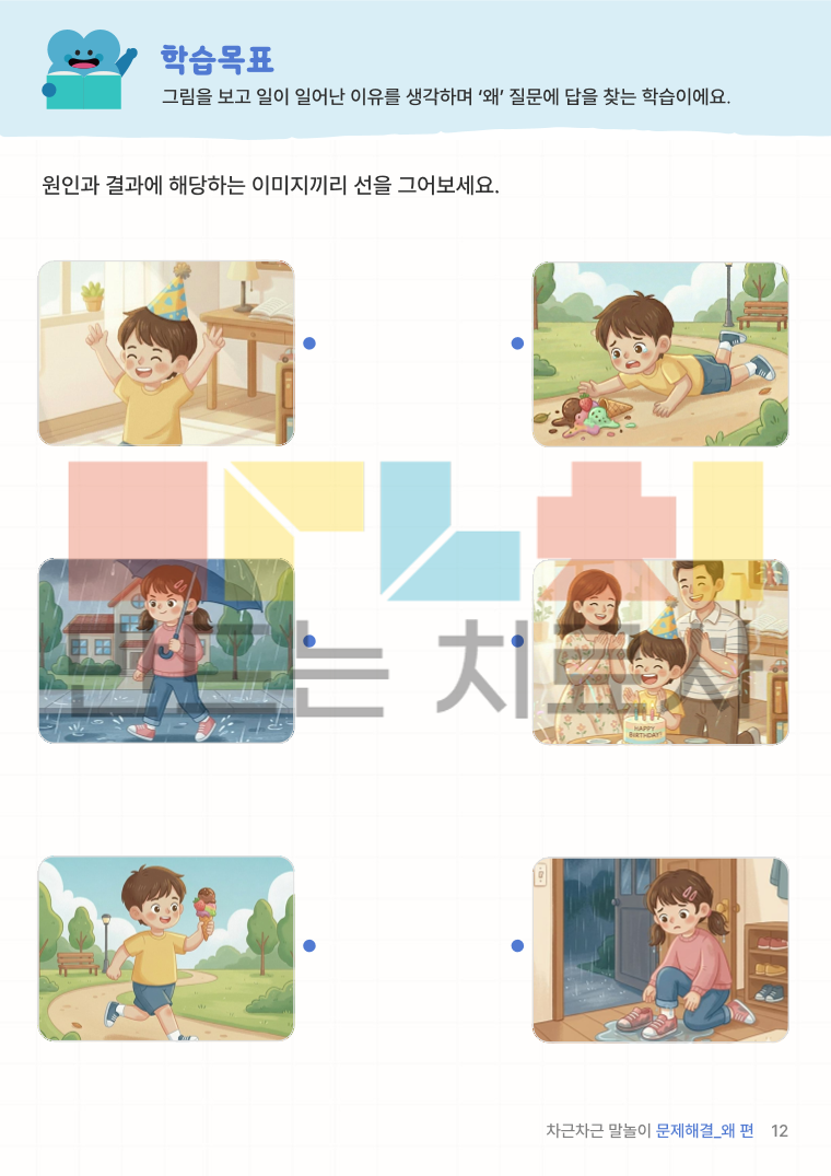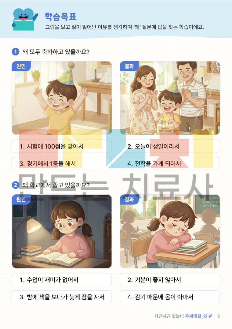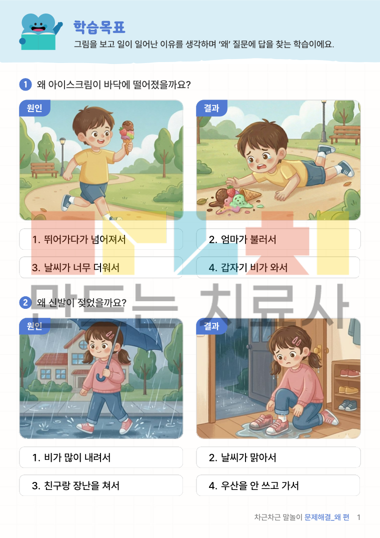 「차근차근 말놀이_문제해결_왜 편」 학습지는 아동이 그림과 상황을 통해 의미, 문장, 이야기 흐름을 단계적으로 이해하도록 돕는 언어치료 중재 중심 학습지입니다. 개념을 처음 인식하고, 시각적 단서를 통해 구분하며, 선택과 배열 활동을 통해 의미를 이해하고, 이야기 맥락 속에서 자연스럽게 언어 이해를 확장하도록 구성되어 있습니다. 치료실 수업, 소그룹 수업, 가정 연계 과제까지 바로 활용할 수 있도록 구성된 언어 중재 학습지 시리즈입니다.