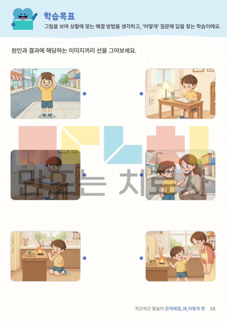 「차근차근 말놀이_문제해결(왜·어떻게) 편」 학습지는 아동이 그림과 상황을 통해 사건의 이유와 해결 방법을 이해하도록 돕는 언어치료 중재 중심 학습지입니다. 상황의 원인을 이해하는 ‘왜’ 질문에서 시작하여, 문제를 해결하는 방법을 생각하는 ‘어떻게’ 단계로 확장되도록 구성되어 있으며, 개념을 처음 인식하고, 시각적 단서를 통해 구분하며, 선택과 배열 활동을 통해 의미를 이해하고, 이야기 맥락 속에서 자연스럽게 언어 이해를 확장하도록 구성되어 있습니다. 치료실 수업, 소그룹 수업, 가정 연계 과제까지 바로 활용할 수 있도록 구성된 언어 중재 학습지 시리즈입니다.