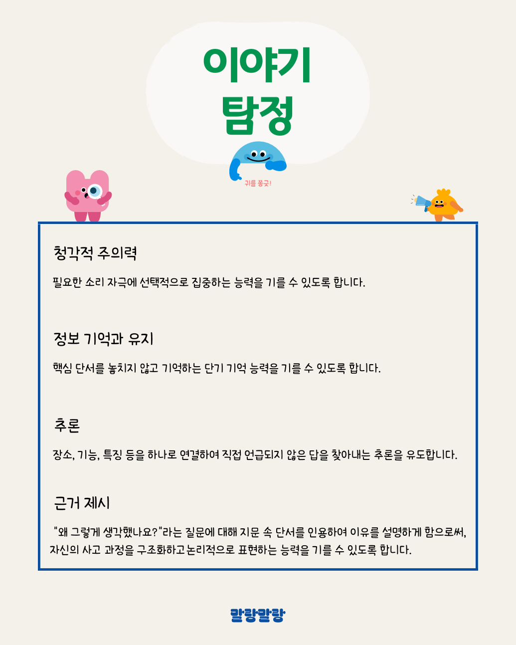 본 활동지는 선생님이 들려주는 이야기를 듣고, 그 내용을 기억하여, 문장 속 숨은 단서를 논리적으로 추론하고 그 이유를 적절하게 설명하기 위해 구성되었습니다.