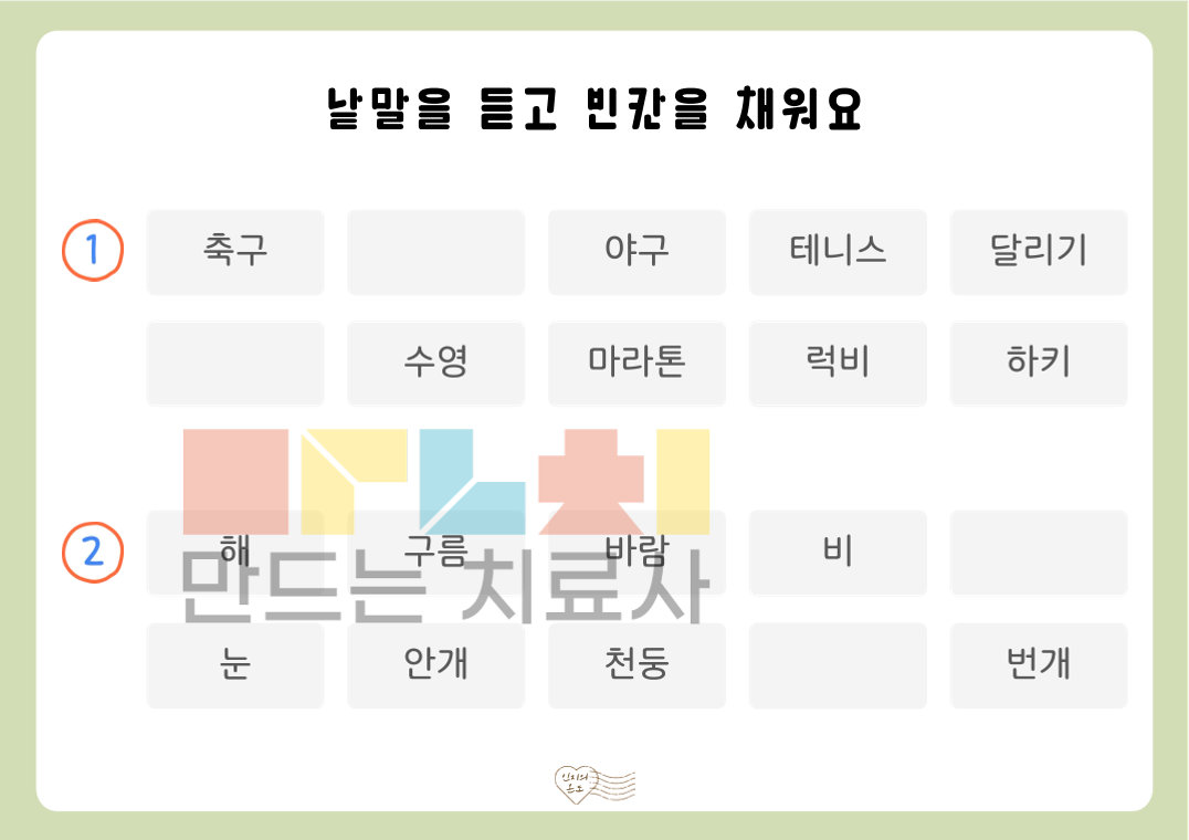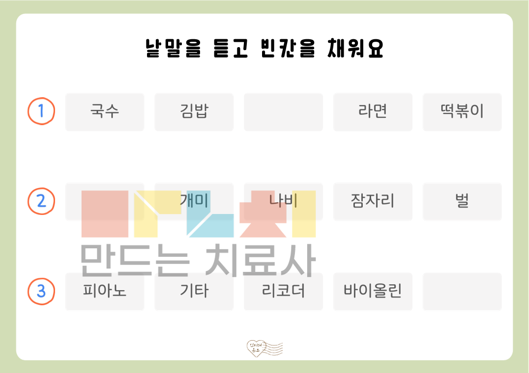 안녕하세요. 인지의 온도입니다. 본 활동지는 ‘듣고 빈칸 채우기(낱말)’ 활동지로, 제시된 순서의 낱말을 들으며 빈칸에 들어갈 낱말을 채우는 활동입니다. 여러 낱말을 순서대로 듣고 이를 유지 및 처리하는 과정을 통해 청각 주의력, 작업 기억, 순서 처리 능력을 기를 수 있습니다. [!] 낱말을 들으며 동시에 쓰거나, 순서를 모두 들은 후 기억하여 쓰는 방식으로도 진행할 수 있습니다. ◎표지1, 활동지20(낱말3~5개: 각 3문항씩 2p 빈칸 1개 , 낱말6~10개: 각 2문항씩 2p 빈칸 2개, 정답지4p)