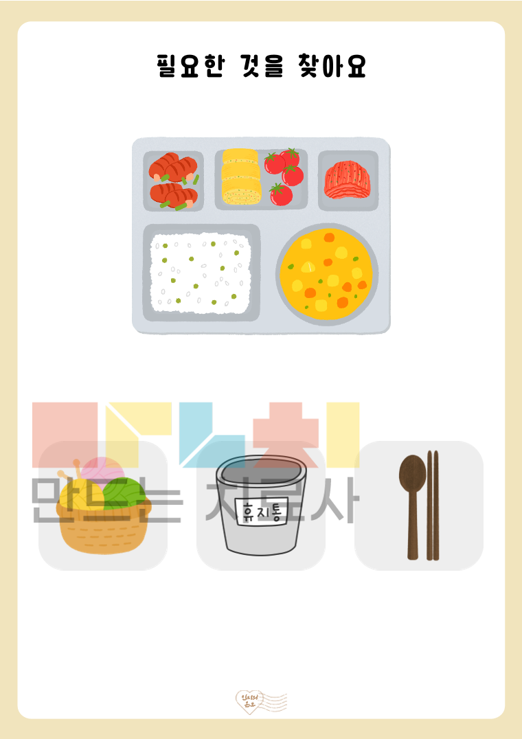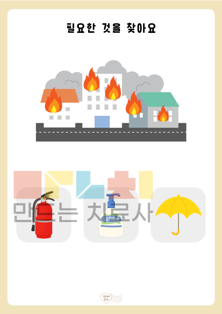 안녕하세요. 인지의 온도입니다. 본 활동지는 ‘필요한 물건을 찾아요(기초)’ 활동지로, 제시된 상황을 보고 해당 상황에 필요한 물건을 선택하는 활동입니다. 기초 단계는 명확한 단서를 바탕으로 정답이 하나로 도출되도록 설계되었습니다. 그림 속 상황을 이해하고, 문제를 해결하기 위해 적절한 도구를 선택하는 과정을 통해 상황 이해력, 문제 해결력, 기능적 사고 능력을 기를 수 있습니다. ◎표지1, 활동지20