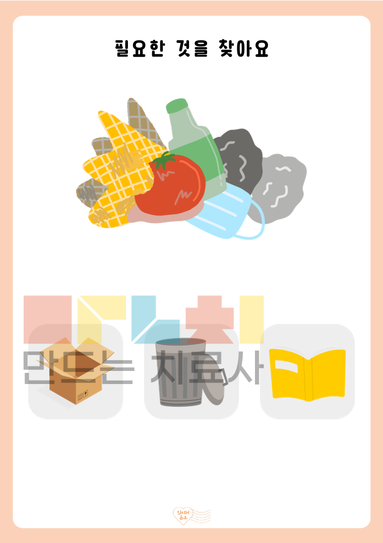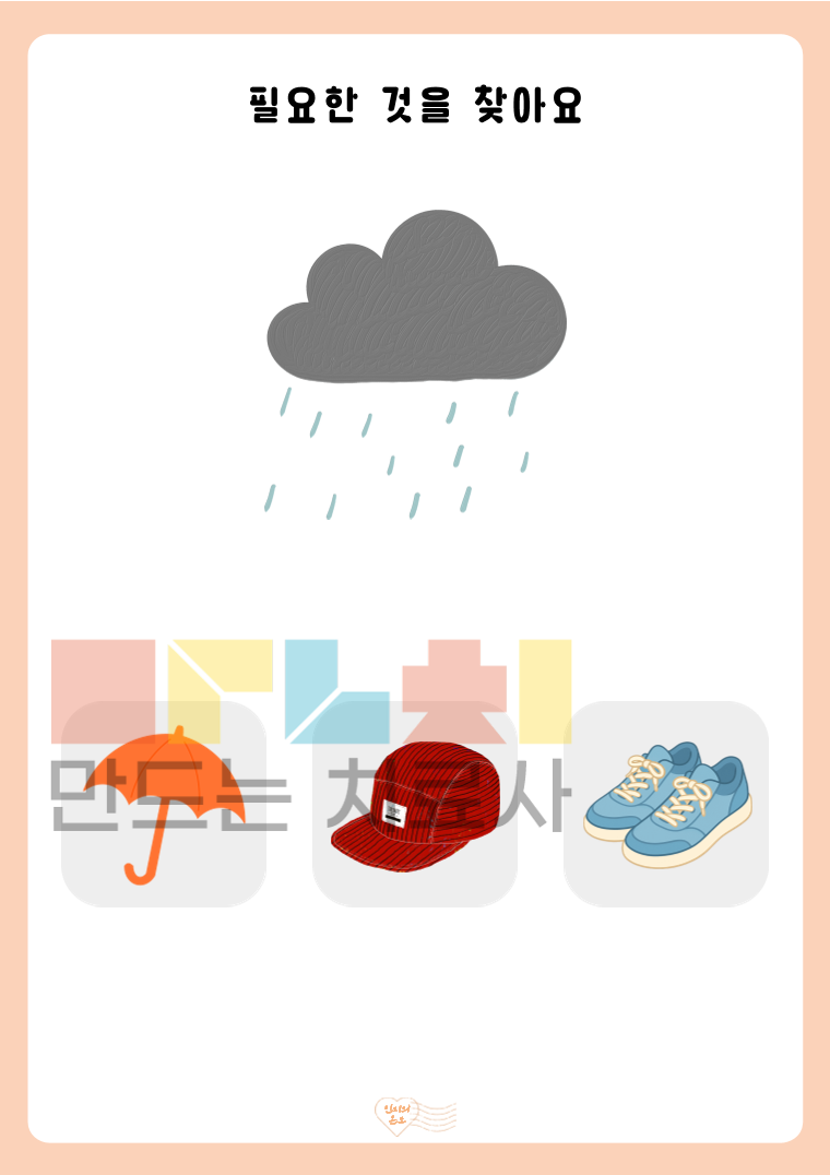 안녕하세요. 인지의 온도입니다. 본 활동지는 ‘필요한 물건을 찾아요(기본)’ 활동지로, 제시된 상황을 보고 해당 상황에 필요한 물건을 선택하는 활동입니다. 기본 단계는 선택지 중에서 가장 적절한 것을 판단하도록 구성되어 있으며, 유사한 상황-기능을 가진 물건을 함께 제시하여 사고를 확장할 수 있도록 설계되었습니다. 그림 속 상황을 이해하고, 문제를 해결하기 위해 적절한 도구를 비교·선택하는 과정을 통해 상황 이해력, 문제 해결력, 기능적 사고 능력, 비교 및 판단 능력을 함께 기를 수 있습니다. ◎표지1, 활동지20