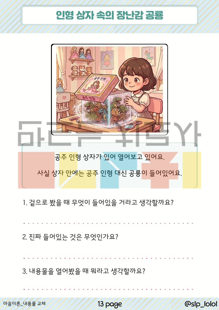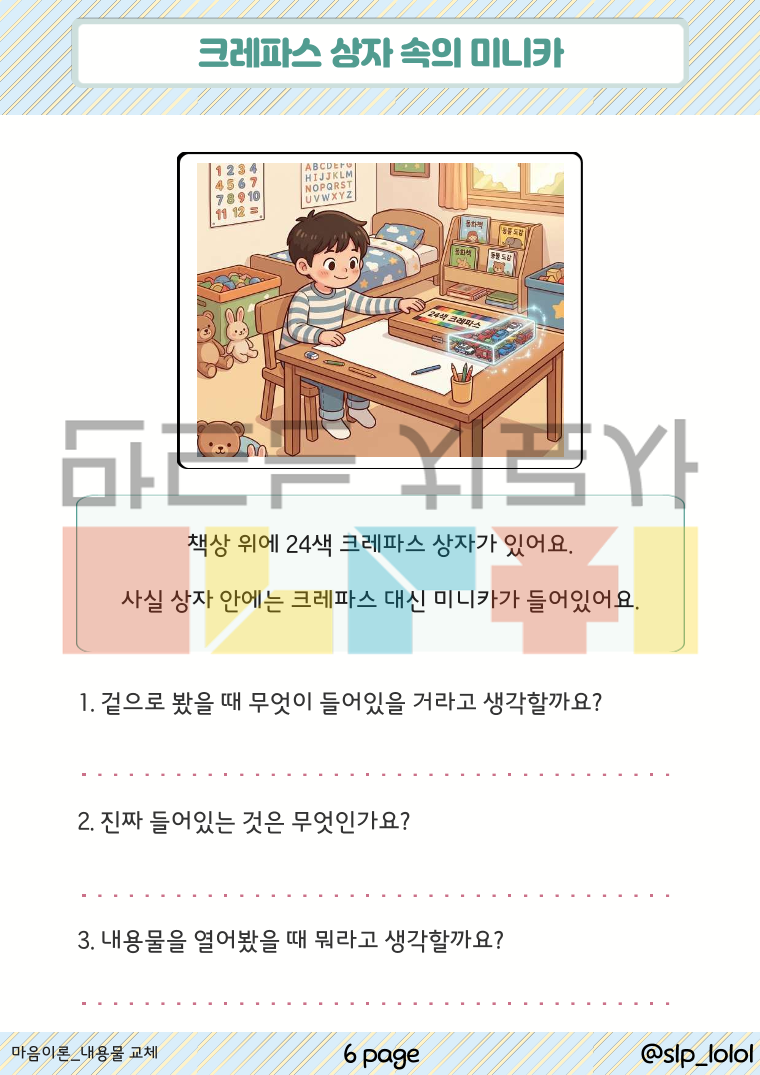 안녕하세요. 롤롤쌤의 화용 시리즈, '숨겨진 마음 읽기' 입니다! 사회적 장면 그림을 보고, 정보의 불균형을 이해하여 타인의 관점을 파악하도록 연습합니다. '상자의 겉모습과 실제 내용물이 다를 때, 타인이 현실과 다른 정보를 믿고 있을 때'의 상황을 집중적으로 학습할 수 있습니다. 마음이론(Theory of Mind)은 상대방의 의도, 신념, 감정이 나와 다를 수 있다는 것을 이해하는 능력으로 "사회적 상호작용에서 매우 중요한 능력"입니다. 먼저 타인의 마음을 읽을 수 있어야, 공감과 배려라는 고차원적인 사회성 학습으로 나아갈 수 있습니다. · 구성 : 총 32p. (표지 포함) 이렇게 활용해보세요! ① 그림 설명 듣고 문제 풀기 ② 그림만 보고 장면 이야기 및 추론하기 ③ 친구와 역할놀이 재연하며 마음읽기