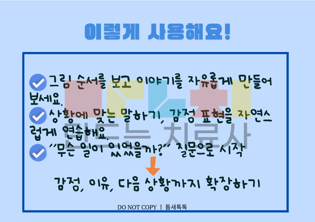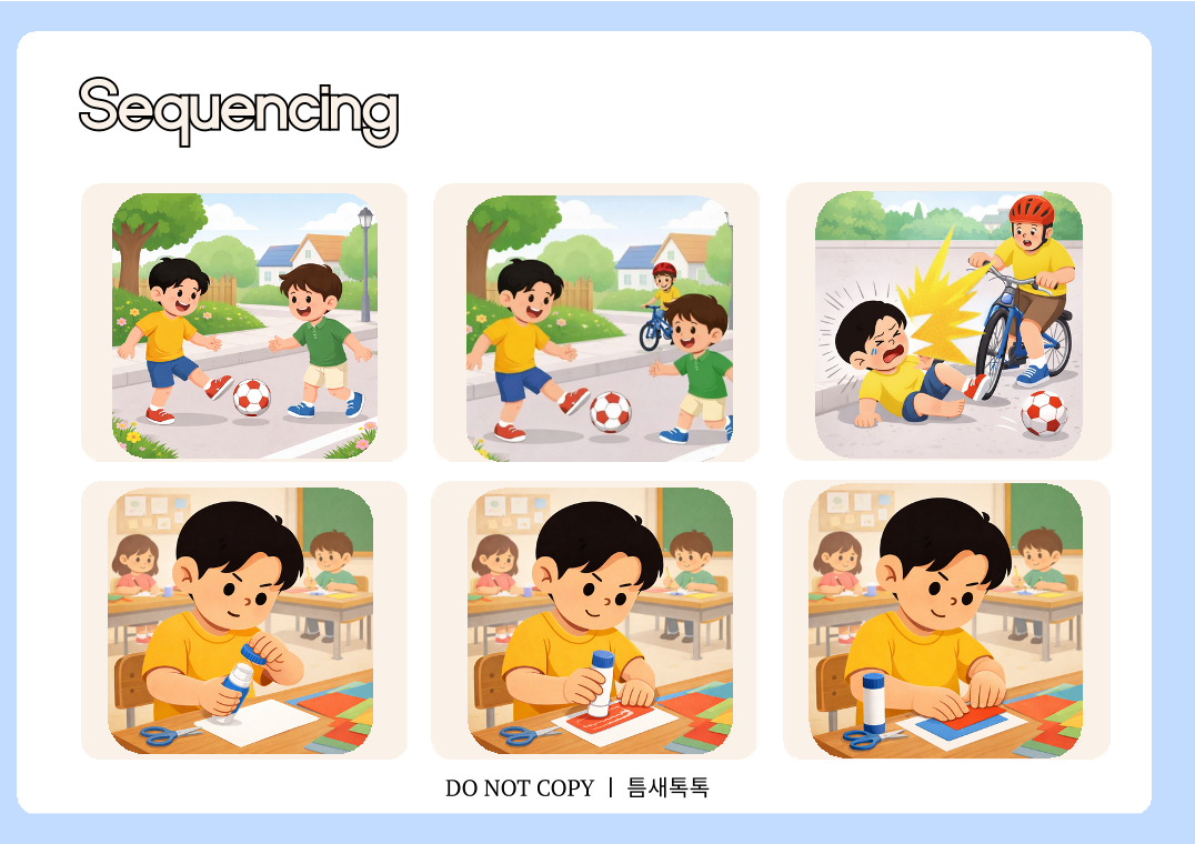 글자가 없는 3컷 그림을 보며 아이가 스스로 이야기를 만들어가는 활동입니다 정답이 정해져 있지 않아 아이의 생각과 언어를 자연스럽게 이끌어낼 수 있어요. 그림의 순서를 이해, 상황의 흐름 파악, 자신의 말로 이야기 표현하는 과정 이해력, 표현력 이야기구성능력이 함께 향상됩니다. 특히 말이 적은 아이 문장 연결이 어려운 아이 상황 설명이 서툰 아이에게 효과적인 활동