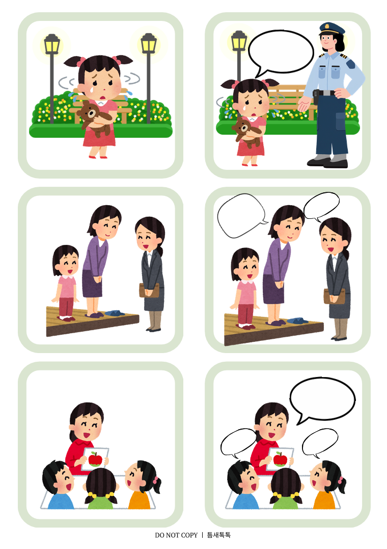 일상에서 자주 겪는 다양한 상황을 그림으로 제시하고, 아이 스스로 상황을 이해하고 말로 표현할 수 있도록 돕는 언어 학습 교재입니다.학습 목표 상황 이해 및 설명하기 적절한 말하기 (화용언어) 원인-결과 추론 능력 향상 사회적 의사소통 능력 강화 본 자료는 파일 용량 제한으로 인해 PART 1 / PART 2 / PART 3으로 나누어 제공됩니다. 각 파트는 서로 다른 상황 구성으로 이루어져 있으며, 함께 활용하실 때 학습 효과가 더욱 높아집니다.