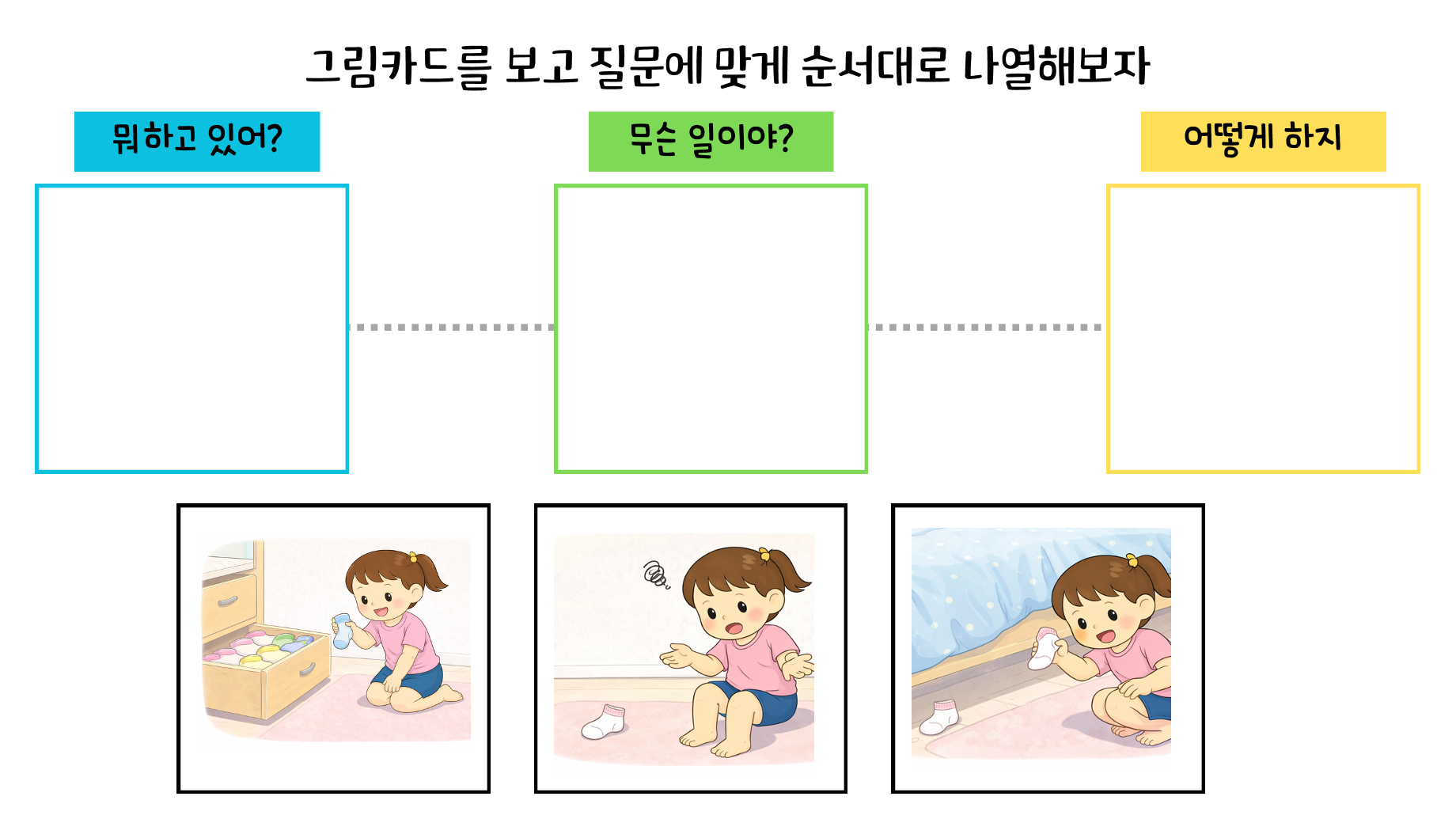 1) 그림카드를 보고 순서대로 나열하기 2) 순서대로 나열된 그림을 보고 질문에 답하기 3) 빈 칸에 알맞은 기분 붙이기 - 말하기 4) 어떻게 해야 할 지 말하기 5) 말풍선을 완성하며 직접 말로 표현하기