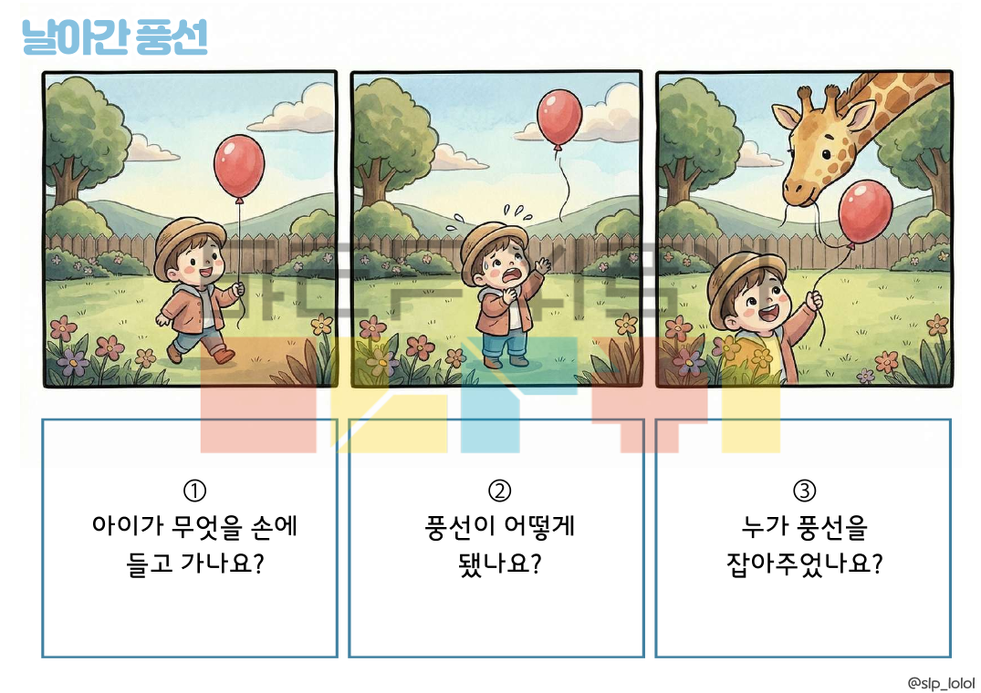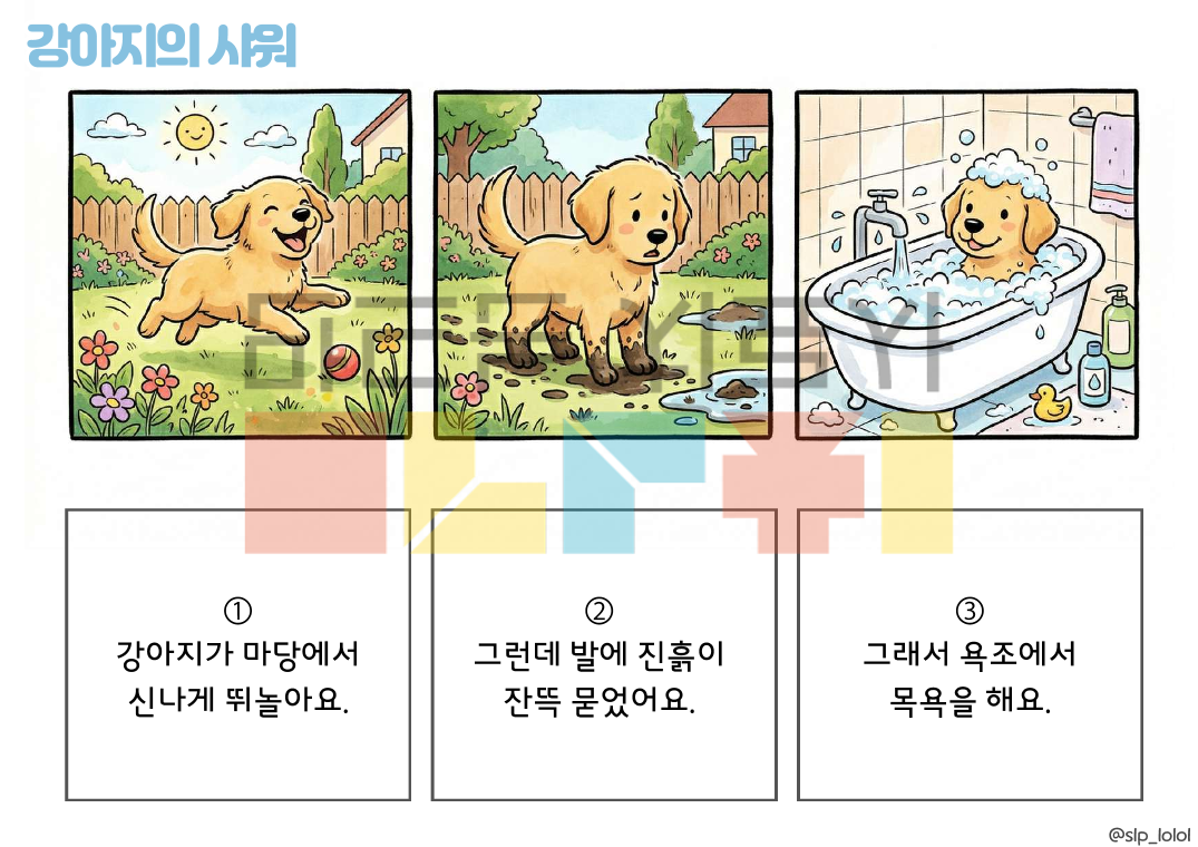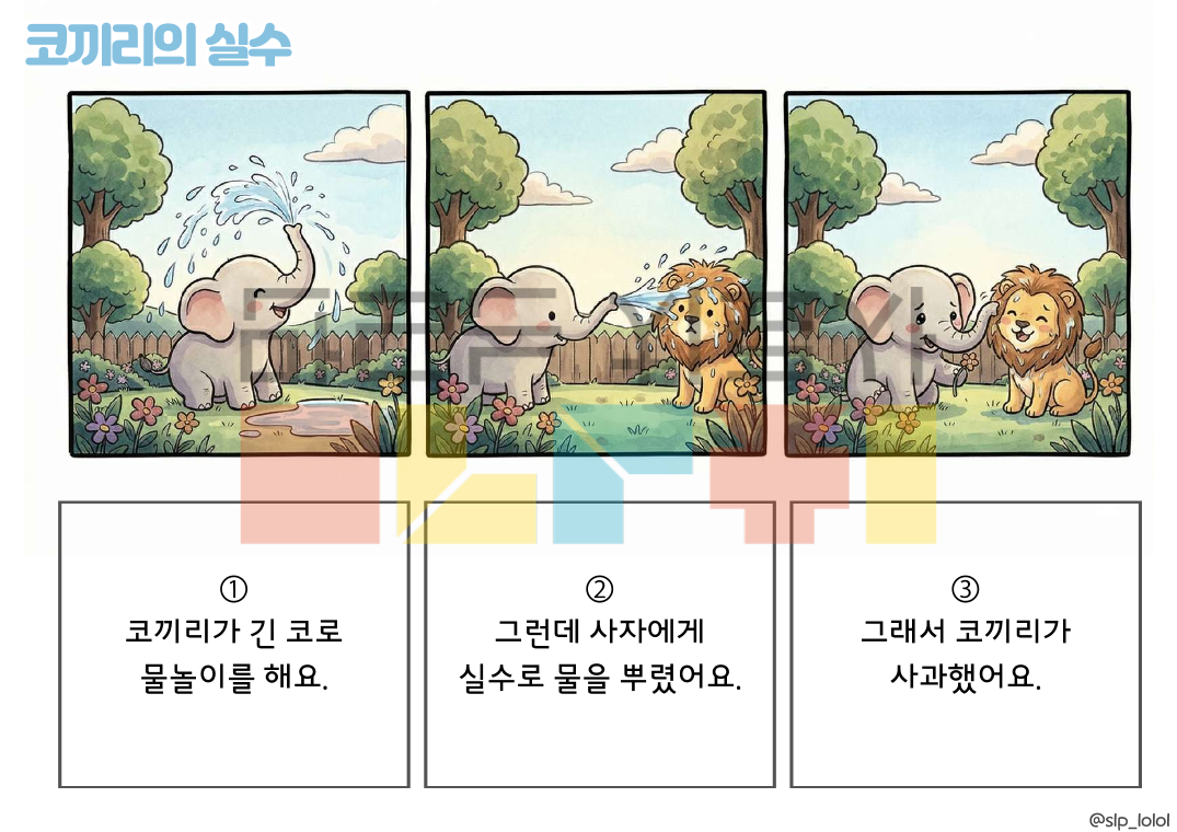 안녕하세요. 롤롤쌤의 화용 시리즈, '3컷 이야기(그런데, 그래서)' 입니다! 이야기 문법을 3단계로 단순화하여 담화 수준의 언어 능력으로 나아가도록 도와주는 자료입니다. 접속사 '그런데/그래서'의 반복 연습으로 논리적 연결성을 강화합니다. * 20가지의 3컷 만화 * 만화 당 3개씩, 총 60개의 의문사 질문 · 구성 : 총 41p. (표지 포함) 이렇게 활용해보세요! ① 이야기 듣고 3컷 만화 순서 정렬하기 ② 그림 보고 3컷 만화 이야기하기 ③ 이야기 질문에 답하기
