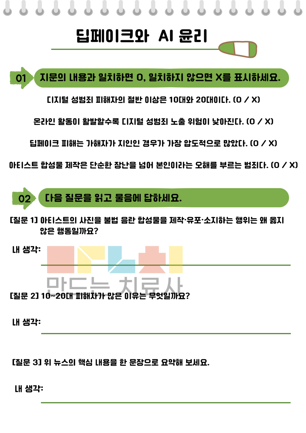 안녕하세요! 이음쌤입니다. 이 자료는 처음 제작한 언어치료 자료입니다! 뉴스 기사와 시사 이슈를 활용하여 만든 학령기(중•고등) 시사 문해력 학습 자료입니다. 청소년기 아이들이 꼭 알아야 할 최신 시사 내용을 바탕으로 어려운 시사 용어 정리부터 0,X퀴즈, 핵심 요약하기까지 단계별 훈련이 가능하도록 구성했습니다. 뉴스 속 복잡한 문장을 직접 분석하고 자신의 생각을 글로 정리하는 과정을 통해 논리적 사고력은 물론 수행평가 대비 쓰기 능력까지 동시에 기를 수 있습니다. 단순한 읽기를 넘어 사회를 바라보는 넓은 시야를 갖출 수 있도록 치료실과 가정에서 전문적인 언어 훈련 자료로 활용해 보세요! * 추가적으로 관련 동영상을 함께 시청하시길 권장합니다.