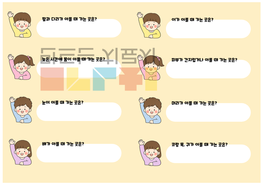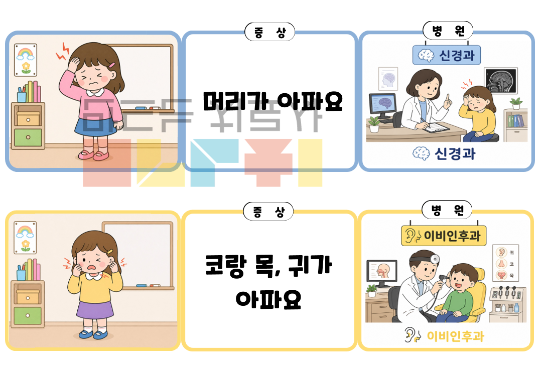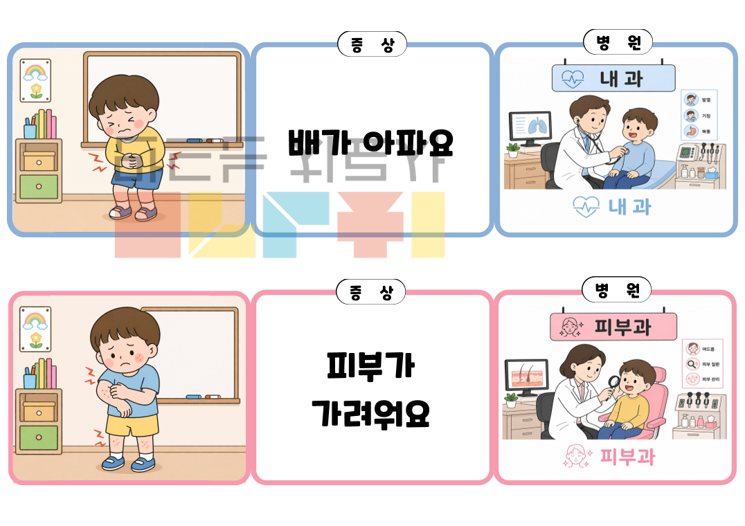 안녕하세요~ 이음쌤입니다! 이번 자료는 "여기가 아플 땐 어디로 가지?"라는 자료입니다. 이 자료는 ‘어디로 가야 할까?’라는 주제를 통해 아이들이 일상에서 자주 겪을 수 있는 상황을 이해하고 적절한 선택을 할 수 있도록 돕는 언어치료 활동 자료입니다. 다양한 신체 증상과 병원 종류를 연결하며 어휘를 확장하고, 상황에 맞는 의미를 파악하는 능력을 자연스럽게 기를 수 있습니다. 또한 그림과 함께 제시된 상황을 해석하고 선택하는 과정에서 추론 능력을 함께 향상시킬 수 있습니다.