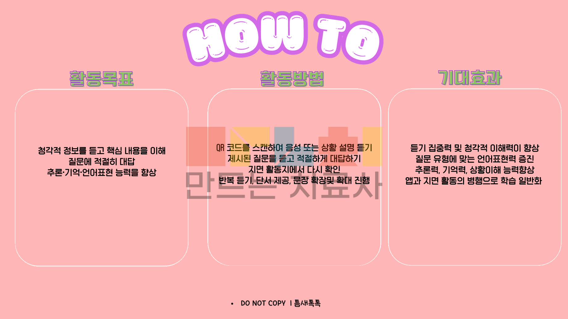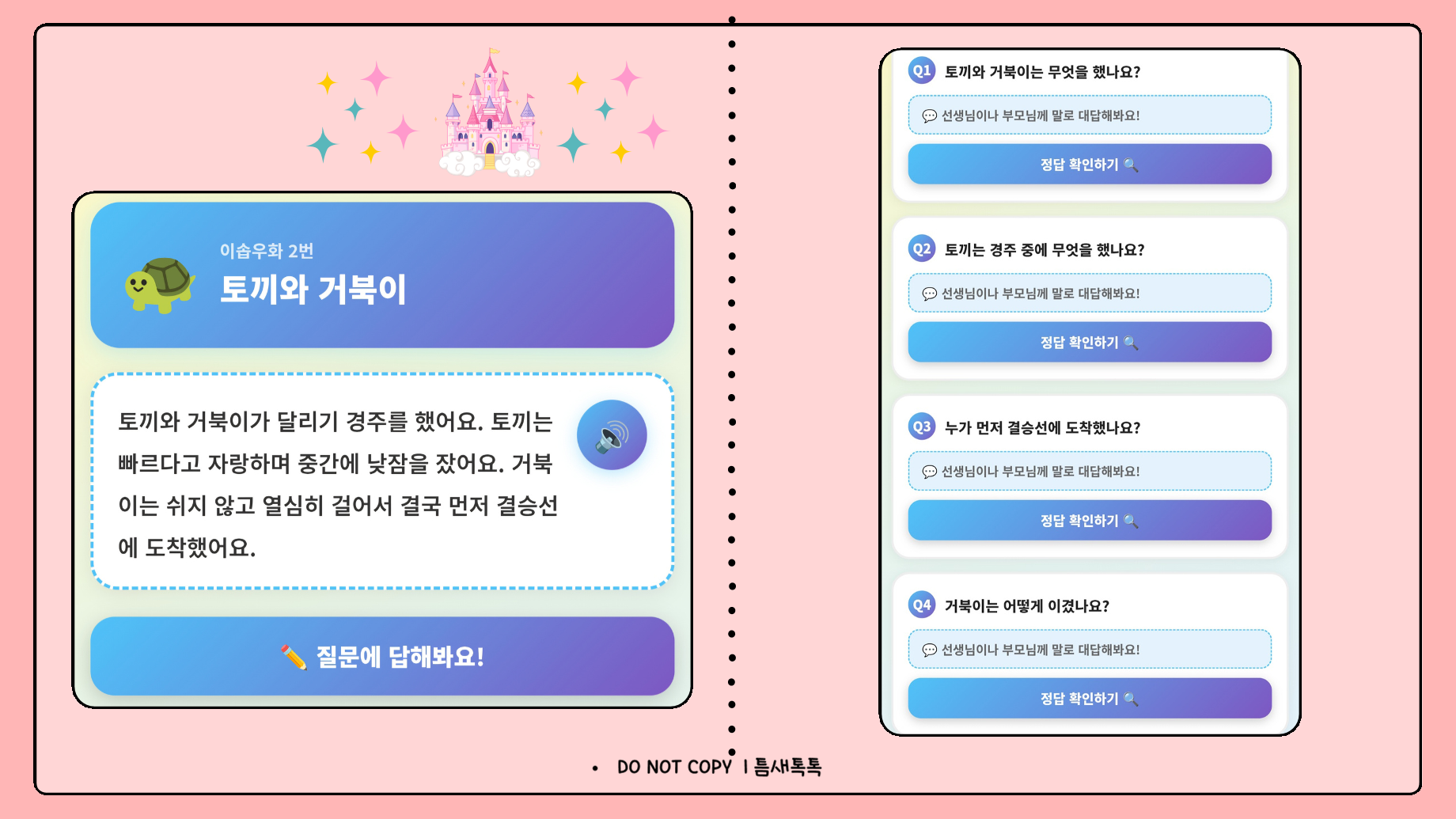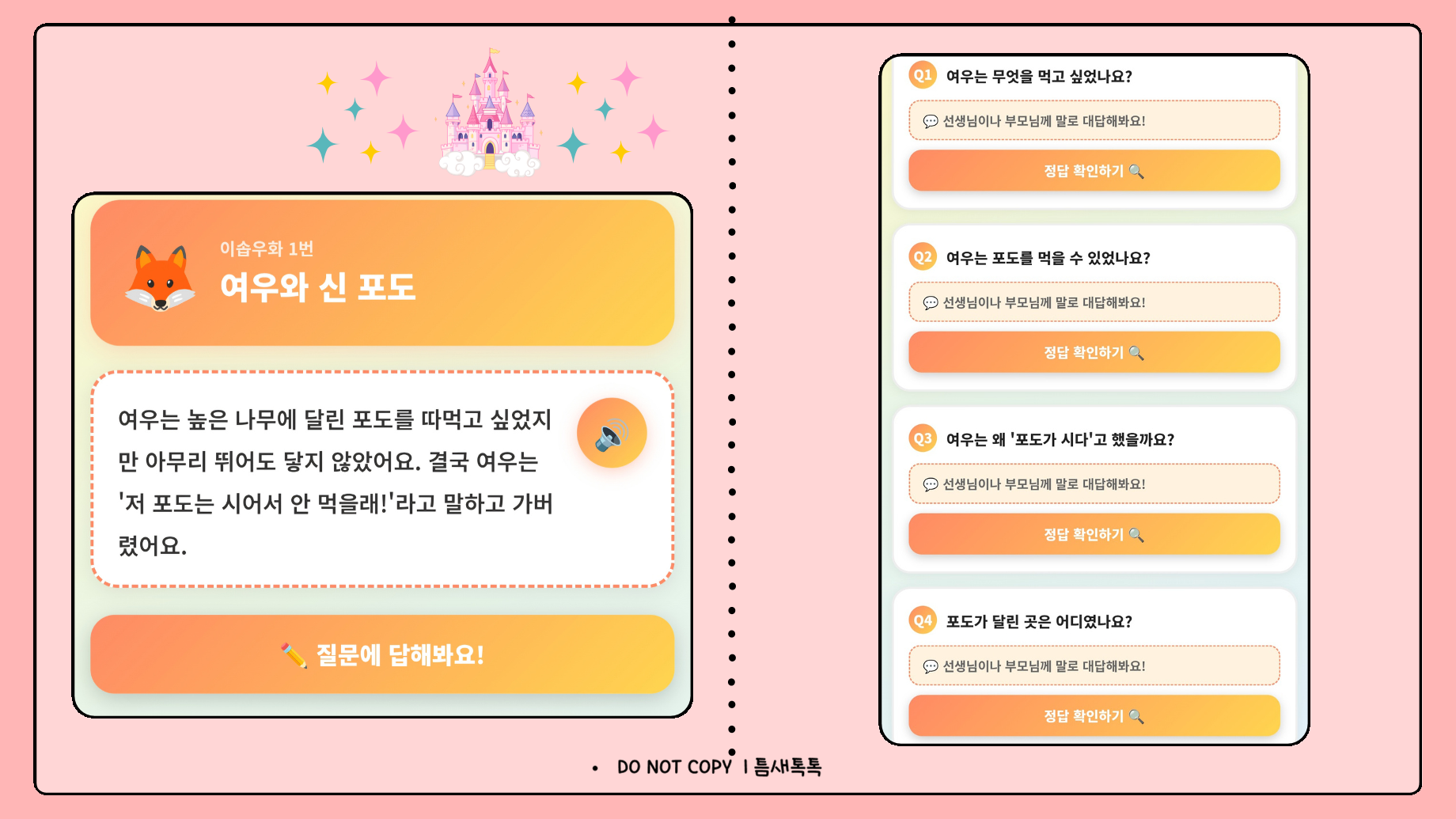 청지각 훈련 → 듣고 이해하기, 핵심 정보 파악 💬 의문사 대답하기 → 누가 / 어디서 / 무엇을 / 왜 / 어떻게 → 상황에 맞는 문장으로 표현 🧠 이해력 & 추론력 향상 → 들은 내용을 바탕으로 상황 이해하기 지면으로 풀고 앱으로 풀기! 목차> 여우와 신포도 토끼와거북이 양치기소년 개개미와베짱이 까마귀와 물병 사자와 생쥐 금도끼 은도끼 여우와 두루미 햇님달님 황금알 낳는 거위 당나귀 소금짐 여우와 포도밭 수닭 사자와 여우와 당나귀 두친구 곰 소년과 개임나무 공작새와 두루미 나그네와 나무 바람과 나무 폭풍과바람 욕심많은 개