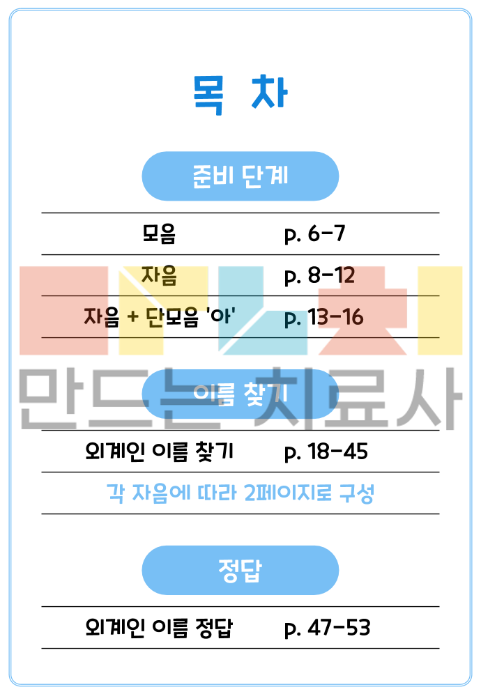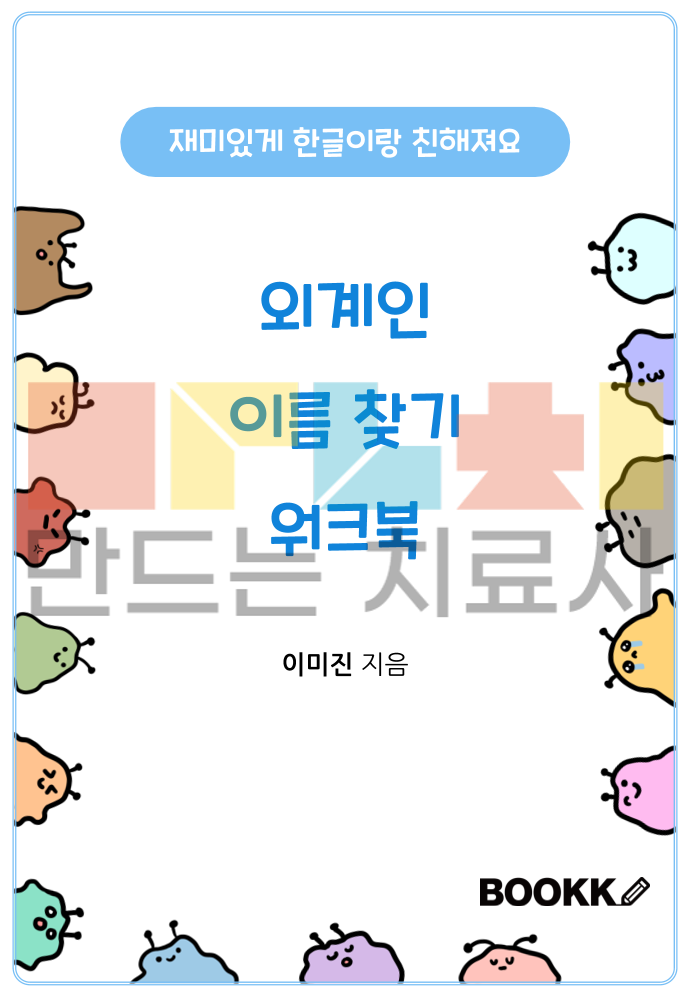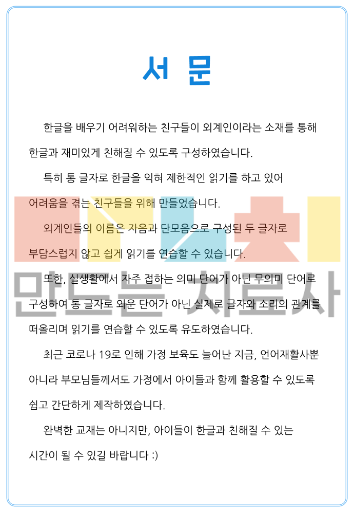 외계인 이름 찾기 워크북 총 54쪽으로 구성된 PDF 전자책입니다. 한글을 배우기 어려워하는 친구들이 외계인들과 함께 재미있게 한글과 친해질 수 있습니다. 자음과 단모음으로 구성된 무의미 단어를 읽으며 글자와 소리의 관계를 떠올리며 읽기를 연습할 수 있습니다 :)