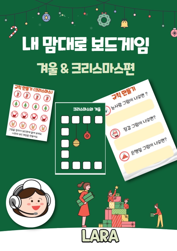 안녕하세요 SLP LARA 입니다. 내 맘대로 보드게임 2탄 겨울과 크리스마스편! 어휘를 배우며, 게임을 이해하고, 새로운 규칙을 만들 수 있어요. 사회성을 위한 짝 및 그룹 수업은 단순히 어휘를 학습하는 것이 아니라 의견을 조율하고, 새로운 규칙을 만드는 목표가 필요합니다. 이러한 목표에 가장 알맞는 활동지 이지요. 필요 시 추가 어휘를 목표로 할 경우 수정 하실 수 있습니다. 조금 더 높은 난이도를 원하신다면 황금 카드를 사용해보세요! 자유롭게 규칙을 만들 수 있어요. 연령 추천 : 학령 전기 및 학령기 수업 형태 : 짝/그룹/개인 목표 1. 겨울 및 크리스마스 어휘 2. 게임 방법 이해하기 3. 협동하여 게임 만들기 4. 게임 규칙 의논하기 감사합니다!